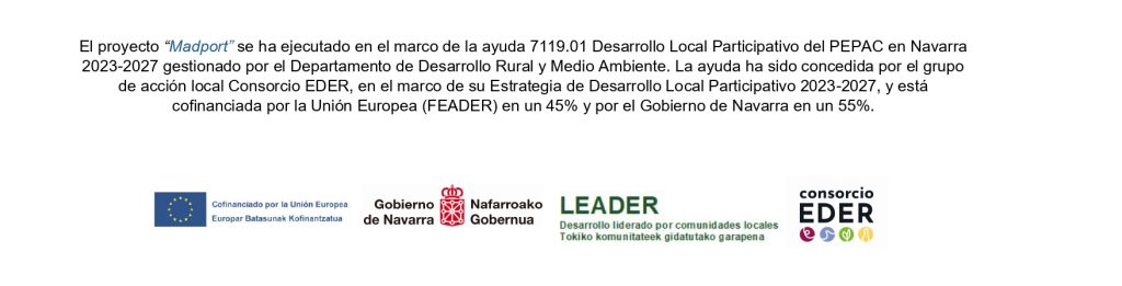 El proyecto “Madport (GALA ESTUDIO) ” se ha ejecutado en el marco de la ayuda 7119.01 Desarrollo Local Participativo del PEPAC en Navarra 2023-2027 gestionado por el Departamento de Desarrollo Rural y Medio Ambiente. La ayuda ha sido concedida por el grupo de acción local Consorcio EDER, en el marco de su Estrategia de Desarrollo Local Participativo 2023-2027, y está cofinanciada por la Unión Europea (FEADER) en un 45% y por el Gobierno de Navarra en un 55%.